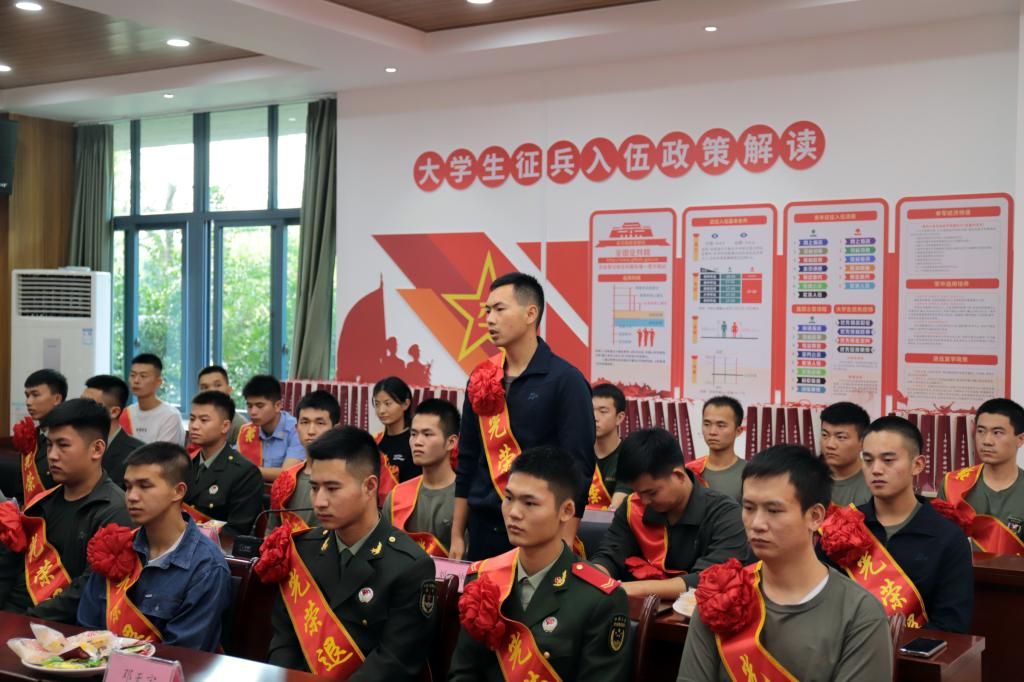 校党委副书记李辉为退役大学生依次佩戴印有“光荣退伍”字样的绶带。随后,退役复学大学生们分别对自己的军旅生活、复学后适应情况、学习生活状态等依次进行分享,并对学费减免及免修课程申请等方面与相关老师进行了交流。