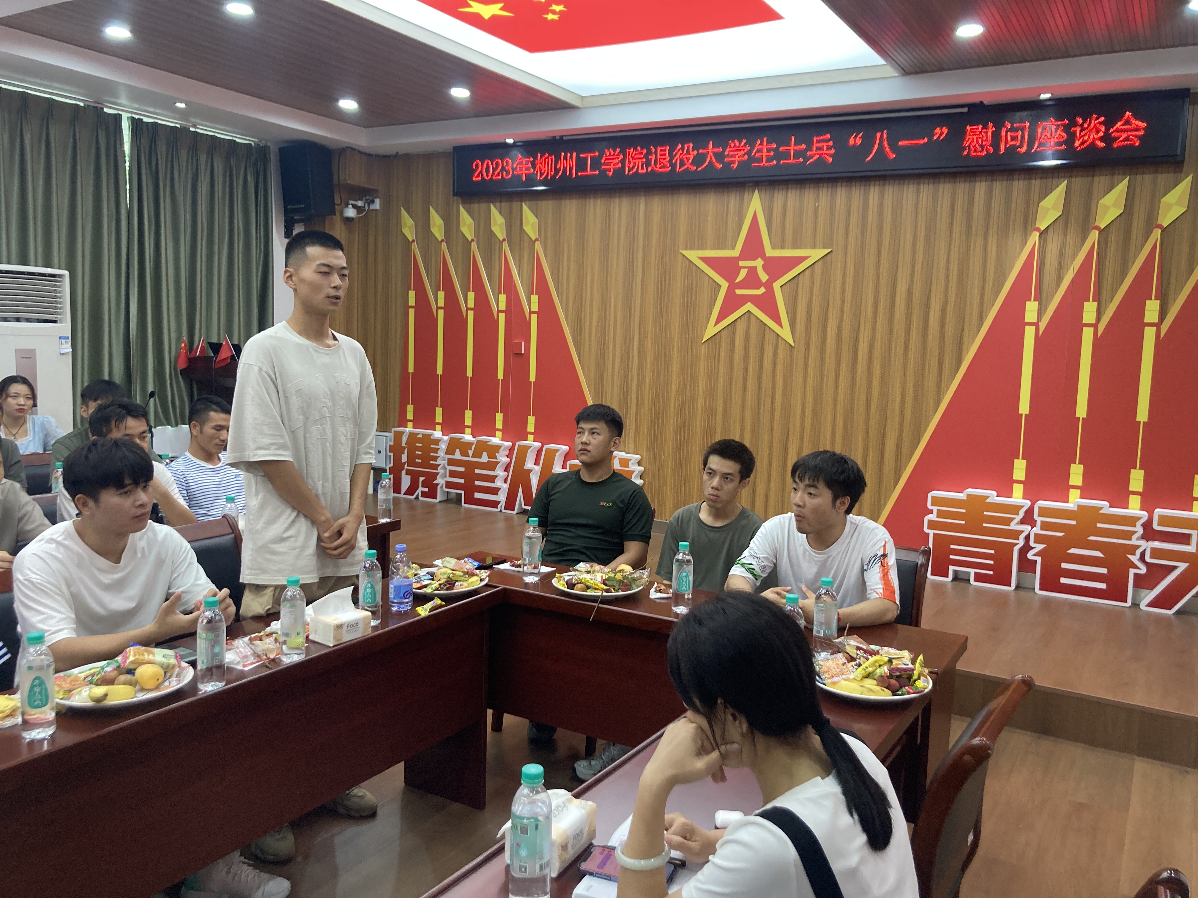 座谈会在雄壮的国歌声中拉开序幕,随后进入自由交流环节,在场的同学们依次各抒己见,大家从军旅经历、成长感悟、退役复学后的学习与生活等方面进行了交流,对学校及老师的关心和重视充满感激,同时他们还向学校针对退役复学大学生保障工作提出了宝贵意见和建议。