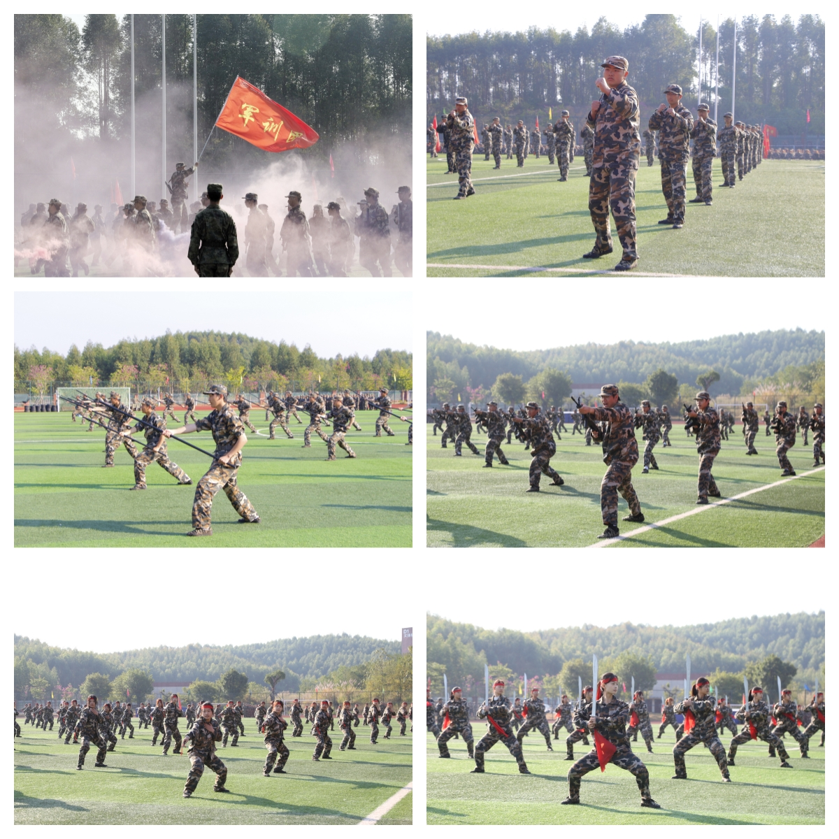 随后,军训成果汇报表演拉开帷幕。受阅方阵以严整的军容军姿进行分列式展示,依次走过主席台前接受领导嘉宾与师生的检阅。军体拳、匕首操、枪阵表演、大刀表演、棍术表演、模拟实战演习等军事汇演项目轮番上场,精彩纷呈,展示了同学们在军训中所取得的丰硕成果。