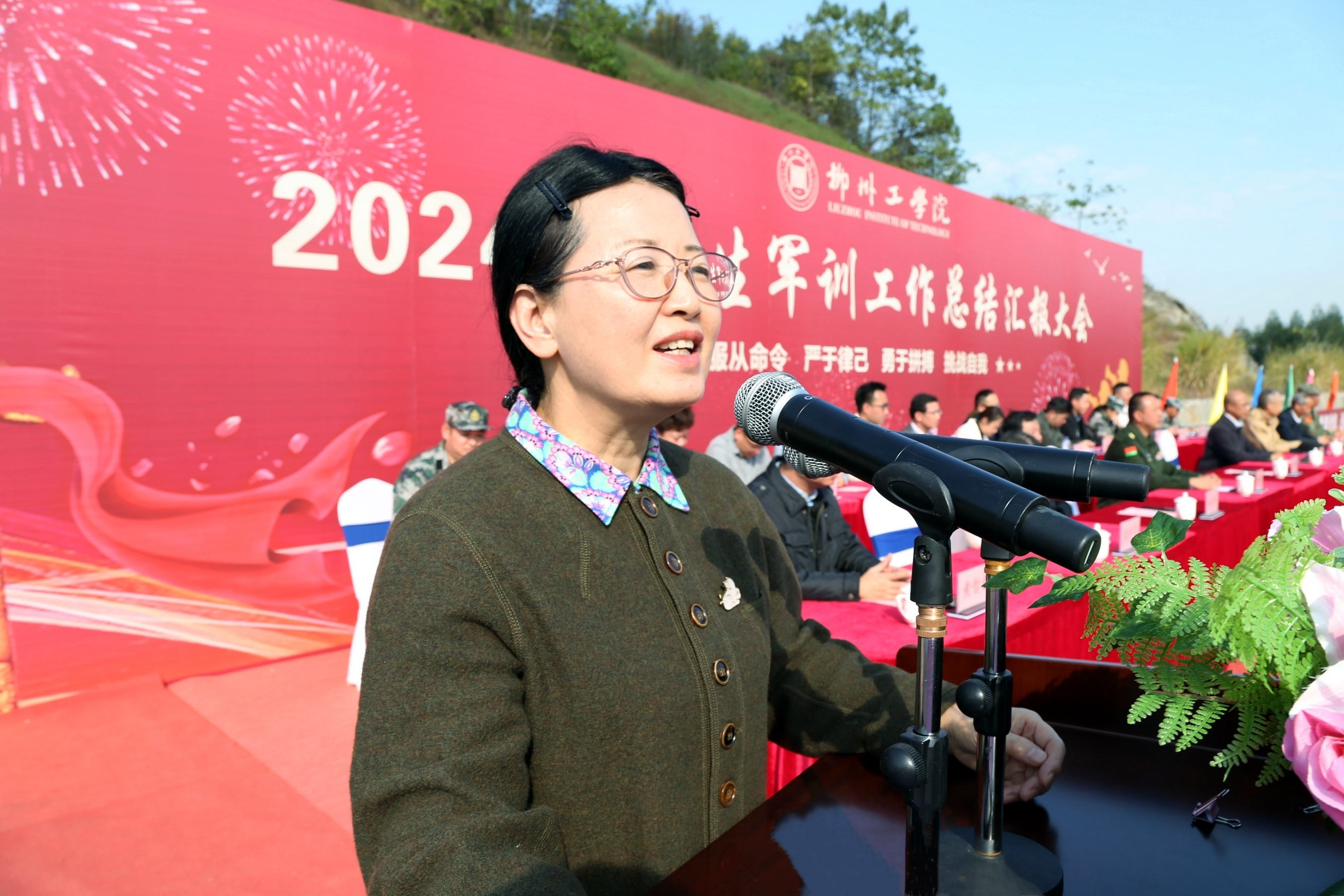 刘军作军训总结讲话。她指出,今年恰逢中华人民共和国成立75周年。在党的领导下,中华民族实现了从站立、富足到强盛的伟大跨越,中国青年正在推进强国建设、民族复兴伟业中展现青春作为、彰显青春风采、贡献青春力量。军训时刻提醒着大家,作为新时代青年,同学们不能忘记革命先辈们的历史,应该跟随时代步伐,为中华民族伟大复兴而奋斗。同学们通过军训进一步提高了政治觉悟,激发了爱国热情,增强了组织纪律,养成了良好的学风、作风和坚韧不拔的意志品质,掌握了基本的军事知识和技能,成为光荣的国防后备军。刘军向全体参训学生提出三点希望:一是希望同学们凝聚军训的“能量场”,变成团结一致的“冲锋队”;二是希望同学们深耕军训的“作战图”,变成强健体魄的“主力军”;三是希望同学们奏响军训的“奋进曲”,变成学校发展征程上的“先锋队”。