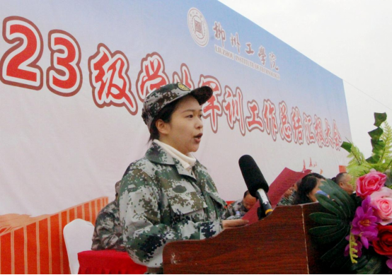 来自八营二连、语言文化与国际教育学院汉教232班的朱思彤同学作为“优秀学员”代表上台发言,食品与化学工程学院马婕老师作为“优秀指导员”代表上台发言。