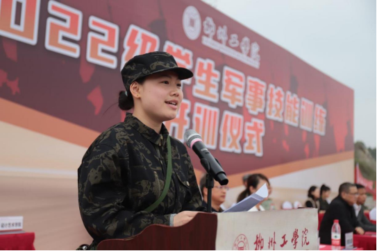 2022级学生军训团四营一连连长房少伟教官作为教官代表发言,来自2022级学生军训团八营三连 、语言文化与国际教育学院英语221班的徐萍同学作为学生代表发言。