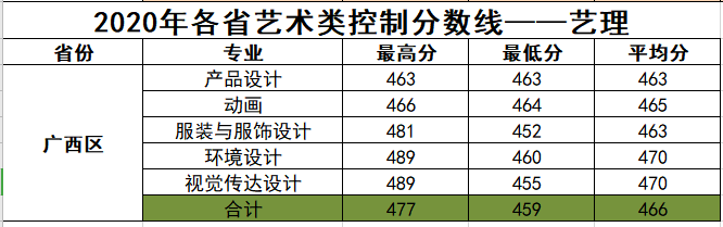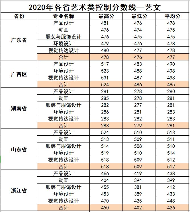 2020年各省各专业艺术类控制分数线统计